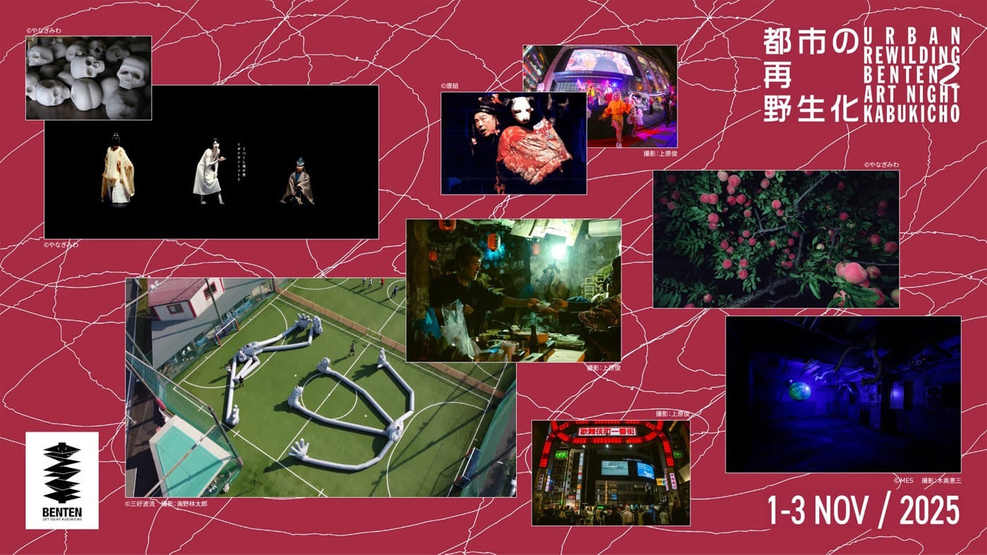 2024年に初開催され、国内外で注目を集めた回遊型アートイベント。今年は、「BENTEN 2 Art Night Kabukicho」として再び歌舞伎町で開催されます。2025年のテーマは「都市の再野生化」。「王城ビル」「新宿歌舞伎町能舞台」をはじめ、個性豊かなスペースを横断的に活用し、アーティストたちが街の空間と対話しながら創作を行います。鑑賞者自身も能動的に街を歩き、アートと交わる体験を通じて都市と芸術の関係を問い直す、またとない機会になるでしょう。