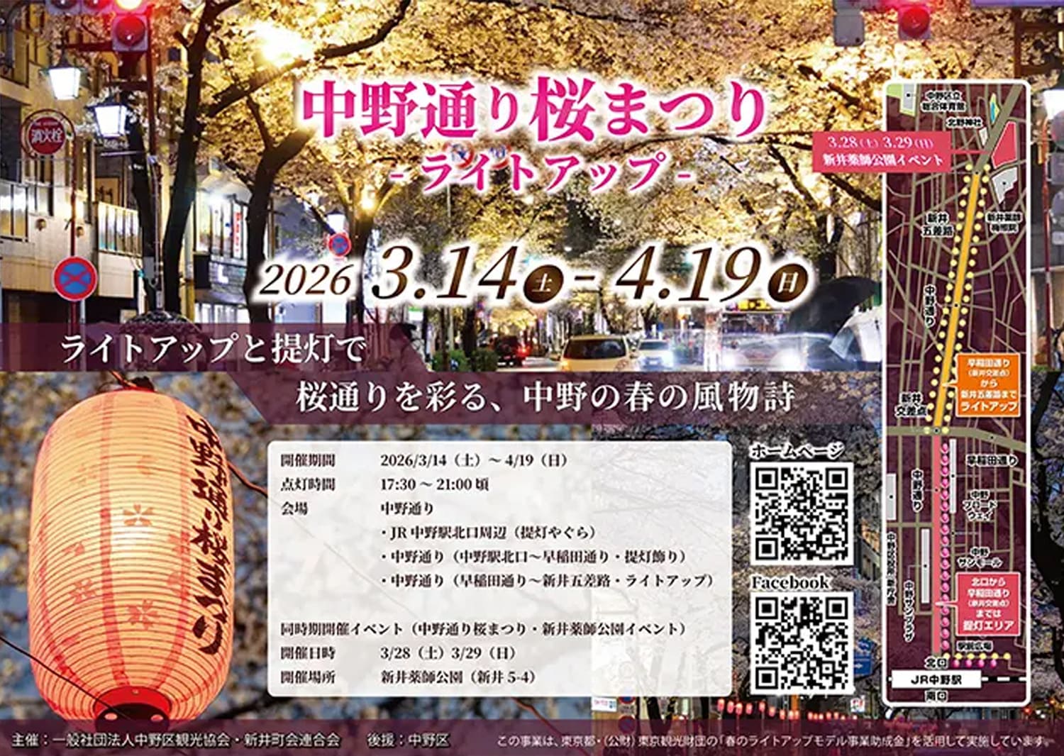 中野の春の風物詩である中野通りの桜。約320本の桜並木は「桜のトンネル」とも言われ、JR中野駅から哲学堂公園までの約2kmにわたり美しい景観を楽しむことができます。今年も桜の木のライトアップに加え、一部区間では提灯の演出が行われます。淡い光に浮かび上がる幻想的な夜桜をぜひ楽しんでください。