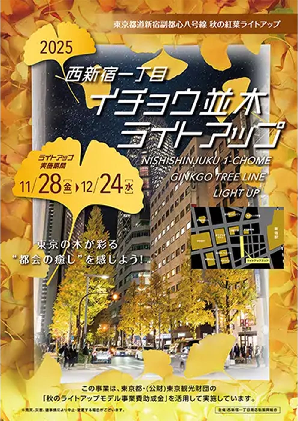 高層ビルが建ち並ぶ新宿区周辺は、再開発中で灯りが少ないことから、イチョウ並木のライトアップを実施。東京都の木イチョウの葉が黄色に色づく頃、クラシカルな色合いの電球色照明を使用したライトアップにより、「都会の癒し」を演出します。日本の美しい風景のひとつである紅葉を生かした魅力的な景観を、都会の真ん中で楽しんでください。