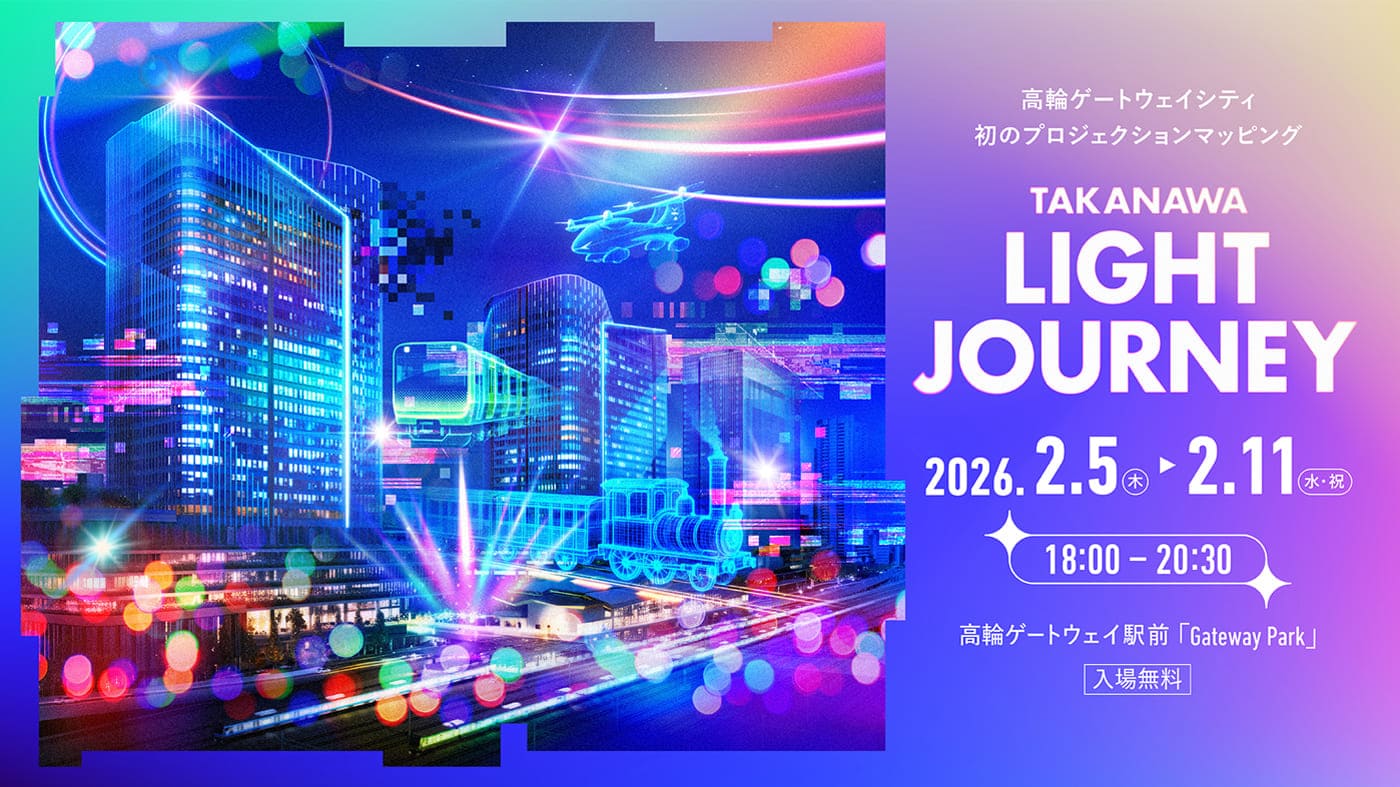 高輪ゲートウェイシティ初となるプロジェクションマッピングイベント「TAKANAWA LIGHT JOURNEY」。本イベントは、光・音・水、そして最先端テクノロジーを融合させた期間限定のプロジェクションマッピングイベントです。日没後のTAKANAWA GATEWAY CITYが、未来的な光のステージへと変貌します。