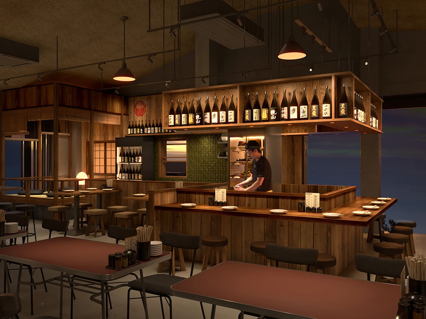 ガレージ風のフードマーケット「ガレーラ フードマーケット 立川」。立川をはじめ、吉祥寺や中野など立川周辺の人気飲食店の新業態や新店など10店舗が出店している。タコス、ビストロ、焼き鳥、寿司、おでん、ちゃんぽん、オイスター、タイ料理などの充実したフードのほか、日本酒やウイスキー、クラフトビールなども楽しめる。
