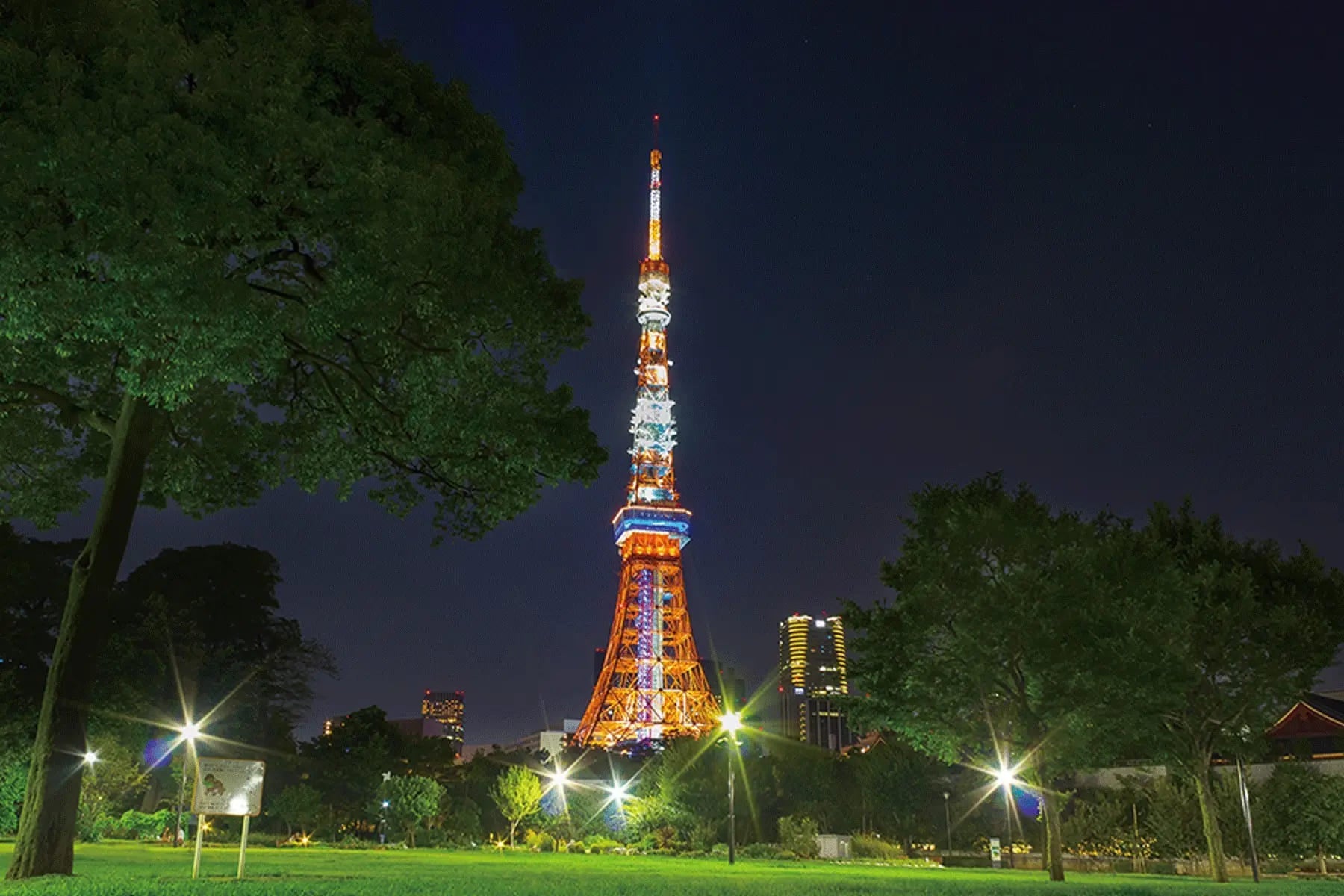 都内の歴史ある公園の一つ。至るところにベンチが設置され、穏やかに灯るライトの下でのんびりできる。広大な芝生広場からは、タワーの全景を撮影可能。