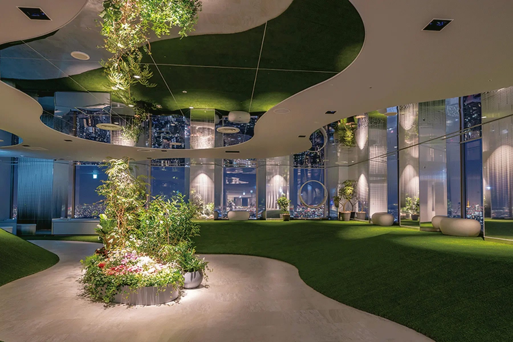 芝生の丘やフォトジェニックなブランコが設置された公園のような展望広場。夜は照明やアロマ、BGMが変わりロマンチックなムードに変貌する。